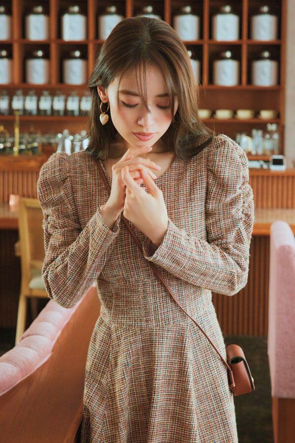 ロイヤルムード漂うツイードワンピースに、トレンドのパフスリーブで都会的な可愛さをトッピング。接近戦でも自信が持てるように、デートでは上半身がぱっと着映えるデザインをチョイスするのがおすすめ。立体感のあるフェミニンディテールなら、顔まわりも明るく見えるし華奢見え効果も期待大!