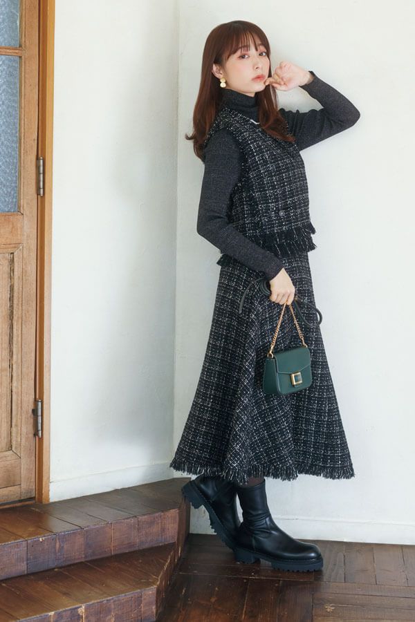 ブーツ¥27,500/ダイアナ(ダイアナ 銀座本店) ベスト¥17,600、スカート¥23,100/ともにアルページュ ストーリー ニット¥14,300/マイストラーダ イヤリング¥4,950/エネーダフランカ(ココシュニック 新宿タカシマヤ店) ネックレス¥41,800/ココシュニック バッグ¥48,400/ケイト・スペード ニューヨーク(ケイト・スペード カスタマーサービス) タイツ¥1,100/満足(福助)