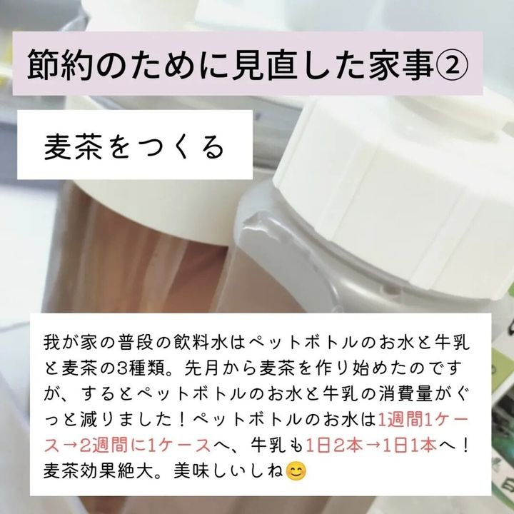 小さなことかもしれませんが、毎朝麦茶を作ることで、わが家は飲み物代を節約しています。起床後にポットでお湯をわかし、ボトルに麦茶パックを入れてお湯を注ぎます。冷めたら冷蔵庫へ。わが家の場合は1Lのボトルを2本用意しており、だいたい1~2日でなくなります。