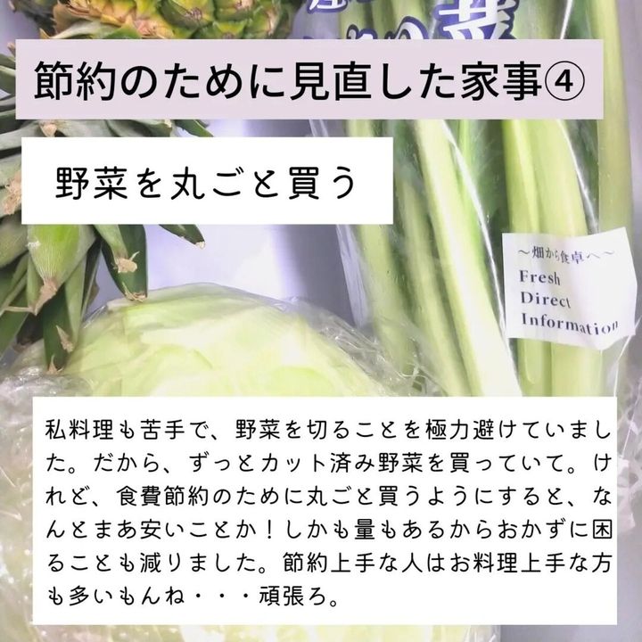 食材を買う際に丸ごと野菜を選ぶようにしました。私は料理が苦手で、以前は包丁を使わずに済むカット野菜ばかり買っていました。