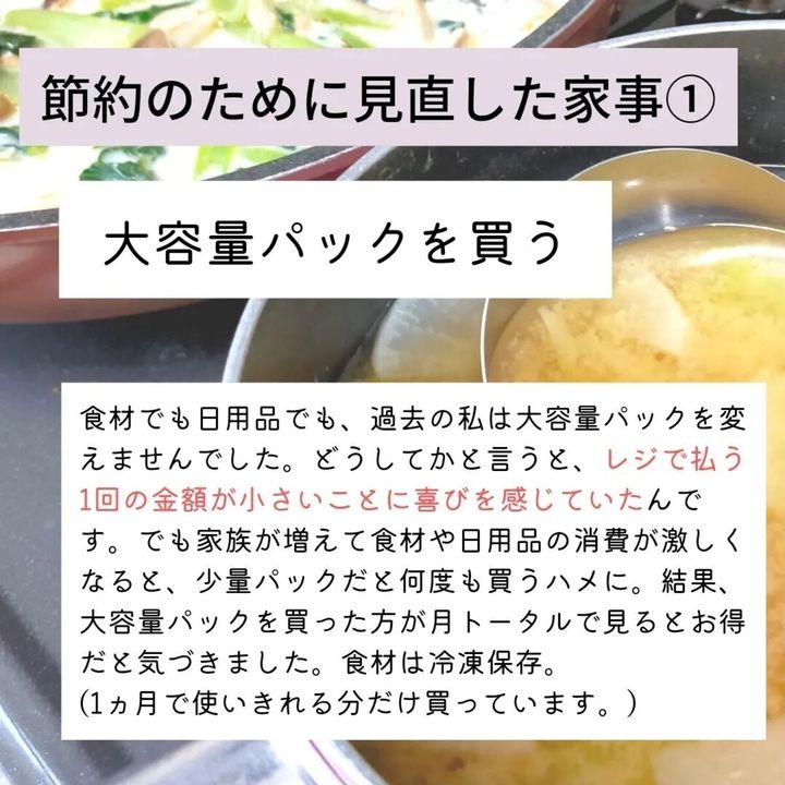 そしてわが家の場合、食材は1~2週間、日用品は1か月を目安にストックを置くように決定。可能な限り大容量のものを選ぶようにしました。すると、(その他の見直しとも合わせて)食費は約1万円、日用品費は約5千円抑えられるように。