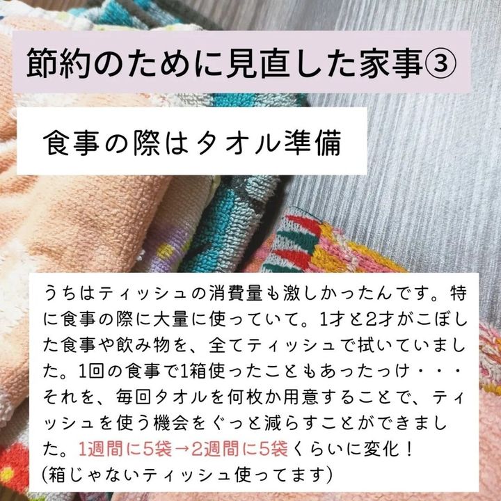 するとティッシュを買う頻度が激変!タオルを洗う手間はありますが、物を大切にする意識も高まり、もっと早く実践すれば良かったと思うほどです。