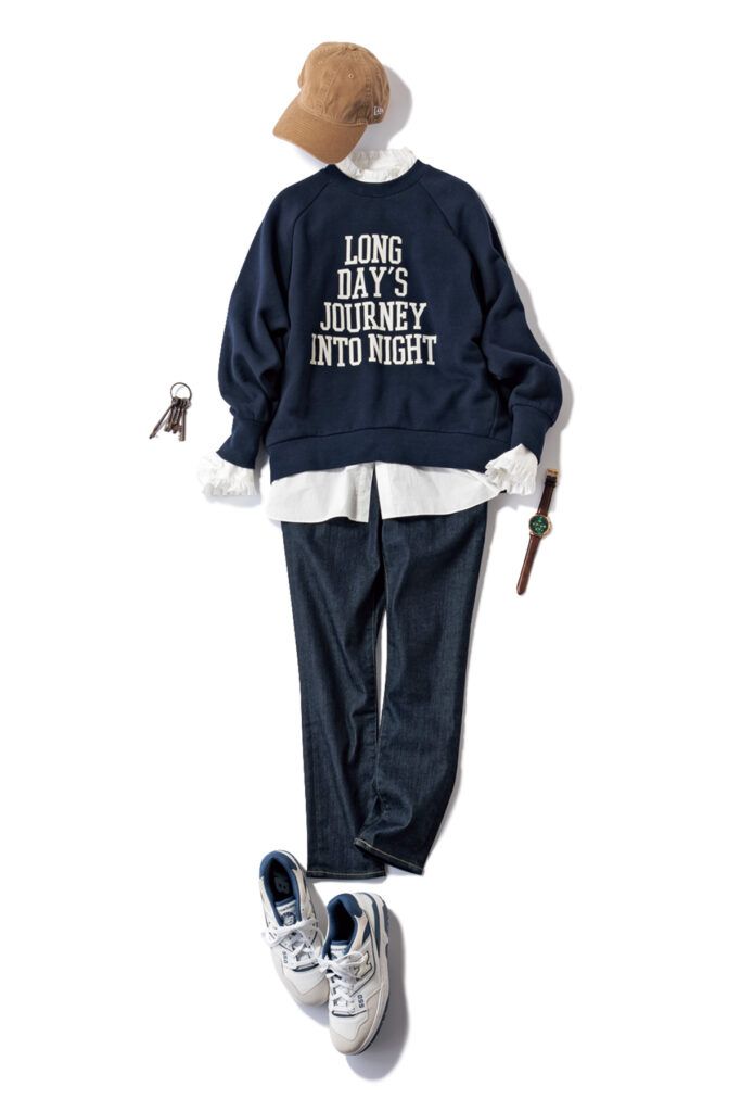 ロゴスウェット着回し フリルブラウス¥39,600(ル ブーケ/ザ ショップ スローン 新静岡セノバ店)リジッドデニム¥23,100(レッドカード トーキョー/ゲストリスト)キャップ¥4,400(ニューエラ)スニーカー¥17,600(ニューバランス/ニューバランス ジャパンお客様相談室)時計¥22,990(クルース/HIROB ルミネ新宿店)