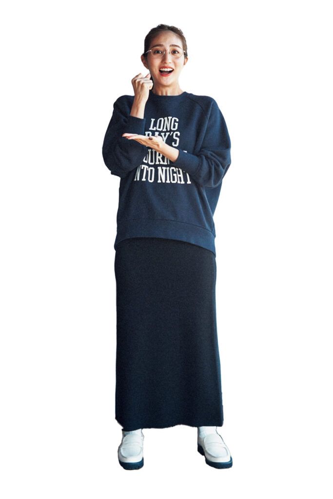 ロゴスウェット着回し 黒ニットスカート¥17,600(ウィムガゼット/ウィム ガゼット ルミネ新宿店)シューズ¥27,500(カミナンド/グラビテート)ソックス¥935(靴下屋/タビオ)メガネ¥21,000(FURLA/デリーゴジャパン)