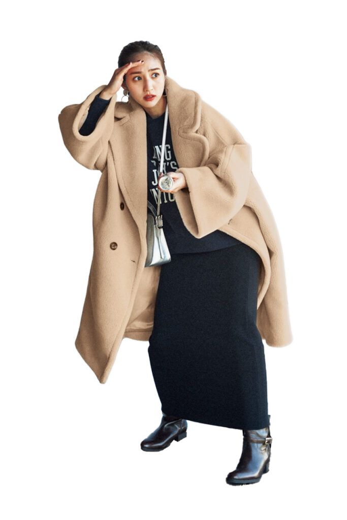 ロゴスウェット着回し 黒ニットスカート¥17,600(ウィムガゼット/ウィム ガゼット ルミネ新宿店)ボアコート¥46,200(セテンス)バッグ¥114,400(J&M デヴィッドソン/J&M デヴィッドソン カスタマーセンター)ブーツ¥41,800(ダイアナ/ダイアナ 銀座本店)イヤリング¥8,800(マージョリー・ベア/ココシュニック 新宿タカシマヤ店)