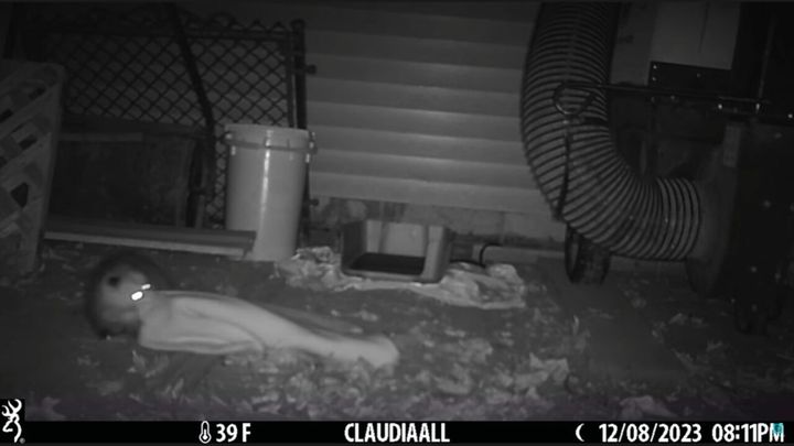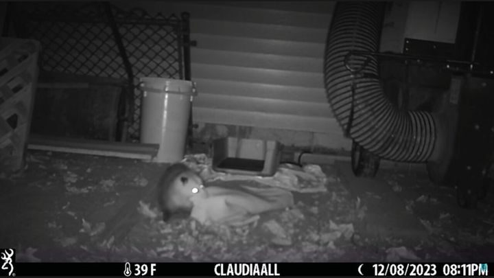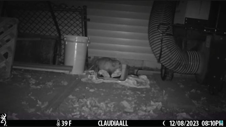 暗闇の中ということもあって分かりにくいですが、そのお客さんというのは・・・アメリカ大陸に生息するオポッサムという生き物でした! こちらのお宅の愛猫用のベッドの中に潜り込んでいるみたいですが・・・