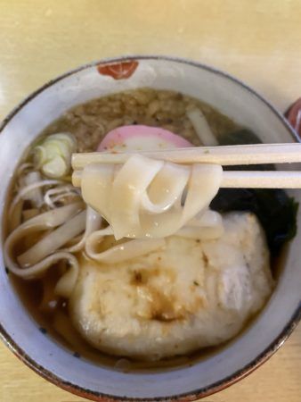 お出汁の効いたお汁、ひもかわの麺、揚げ玉、わかめ、かまぼこ、ネギ、そして香ばしく焼いたお餅!大きい!これがまた美味しいのです。喉越しの良いひもかわ麺がツルツルと。お餅がもっちりと。食感にメリハリ、熱いお汁が美味しい。