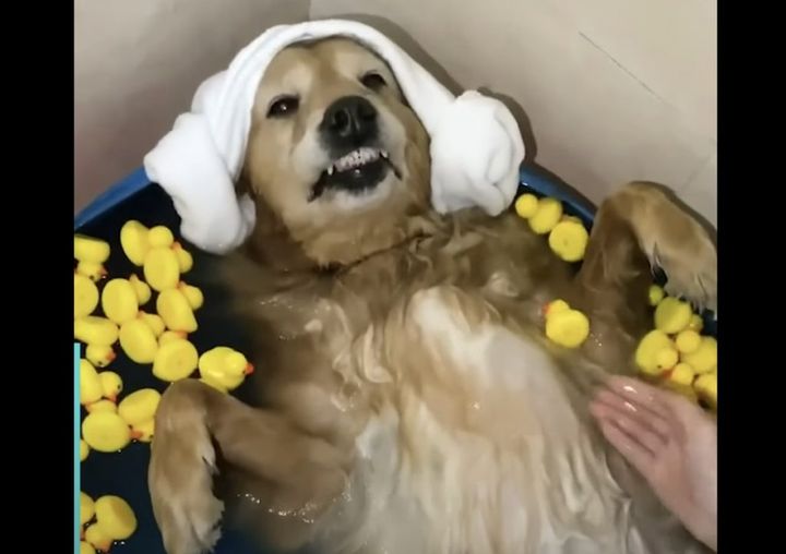 お風呂最高〜! 入浴を楽しむゴールデンレトリバー。