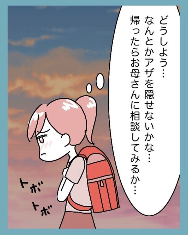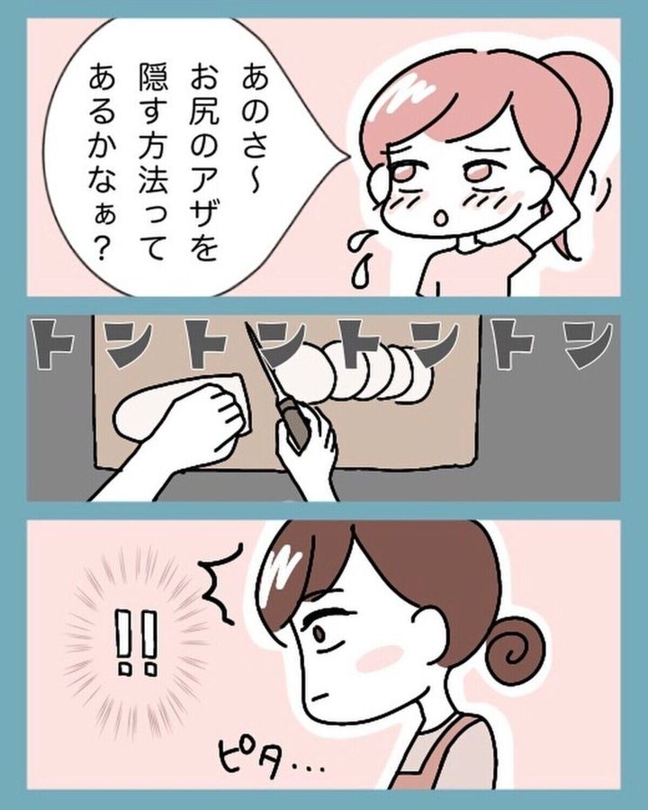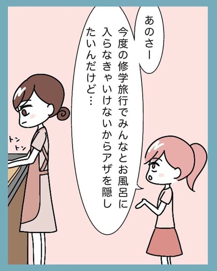 お尻の蒙古斑が気になり、修学旅行でのお風呂が憂鬱だったみぃ子さん。どうにかして蒙古斑を隠す方法がないかと意を決して母に相談をしてみることに。しかし「まだ蒙古斑あるの?」と驚かれたことで「言わなきゃ良かった」と思ってしまいます。