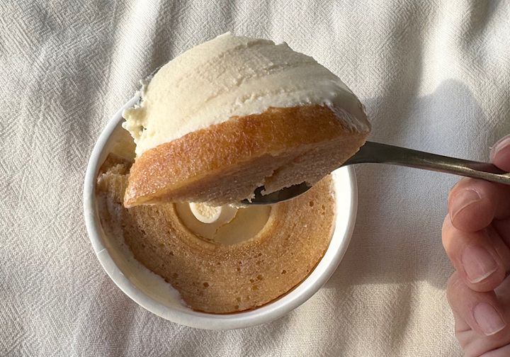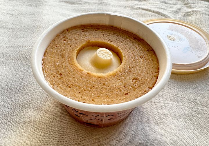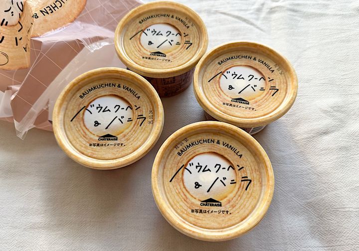 蓋をあけてみると、まるっと贅沢にバウムクーヘンがトッピングされています。バウムクーヘンとアイスが組み合わさっているとは珍しいですよね。筆者はこのコンビのアイスは初めて見ました。バウムクーヘンには風味豊かなラム酒をしみこませているのだそう。
