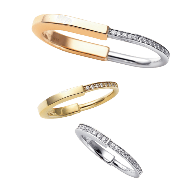 【モデル着用】大切な絆やつながりをイメージ。中指~薬指:〈ティファニー ロック〉2フィンガーリング[K18RG×K18WG×DIA]¥1,232,000、中指:同リング[K18YG×DIA]¥522,500、人さし指:同リング[K18WG×DIA]¥896,500(全てティファニー/ティファニー・アンド カンパニー・ジャパン・インク)