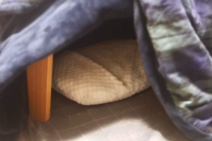 子どもたちの布団を温め終わった湯たんぽはまだまだポカポカなので、使わないともったいない!こたつに入れるとじんわり温かいです。電気代の節約にも役立ちますね。