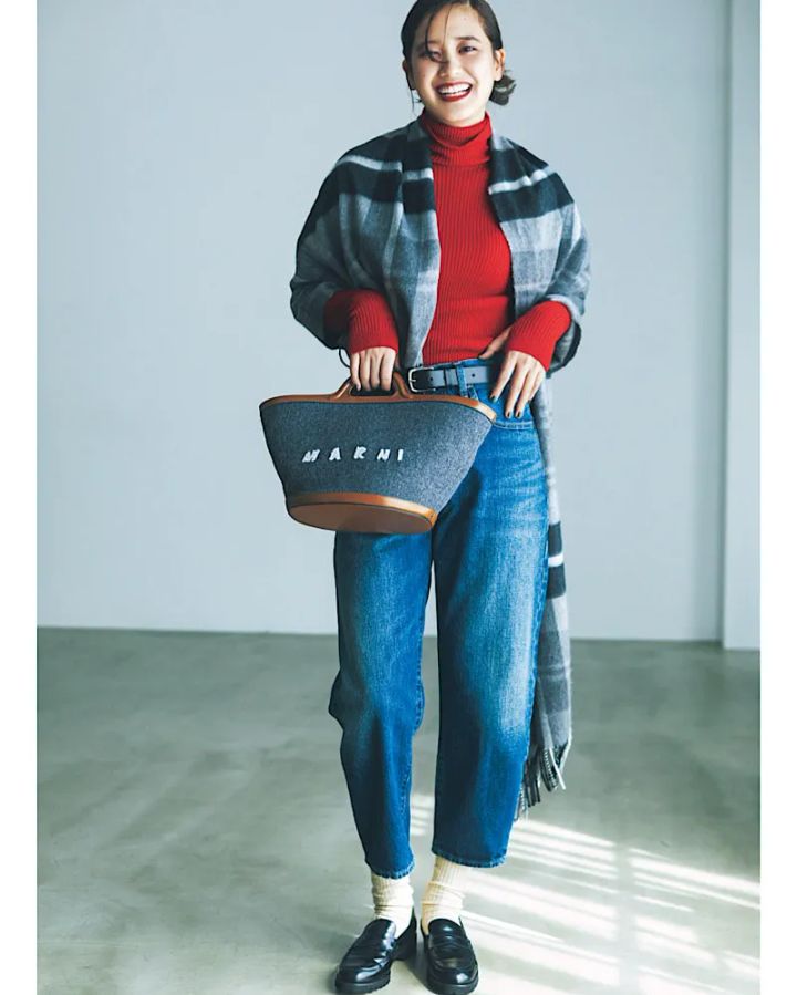 いつものデニムコーデを一歩更新するなら、1枚で着映えするカラーニットを取り入れてみて。チェック柄の大判ストールが、赤ニットの主張をほどよく和らげてくれます。足元はソックス×ローファーで今っぽさをプラス。