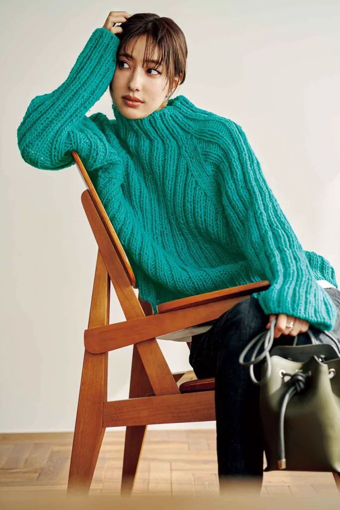 美しいターコイズカラーが目を引くボリュームニットは、ざっくりラフに着るのが今っぽい。太めのリブや絶妙なハイネック加減など、細かいディティールにも注目を。ニット以外は、カーキやブラックなどの落ち着いた色味で全体のカラーバランスを調整して。