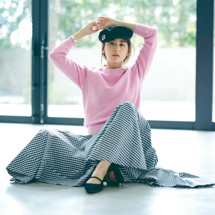 柔らかなピンクニットにギンガムチェックのフレアスカートを合わせた、フレンチシックな大人コーデ。小物はフェミニン要素があるぶん、パキッと引き締まるブラックで統一。アイテム自体はレディライクなのに、どこかカッコいい大人の雰囲気が漂います。