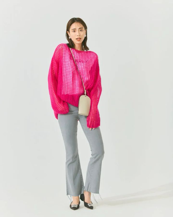 トレンドのシアーアイテムは、秋冬も継続して人気。ビビッドカラーの透け感ニットには、白Tをレイヤードして、異素材MIXの表情を楽しんで。ボトムスは、ピンクと好相性なライトグレーのウォッシュデニムをチョイスしてちょっぴりモードに。