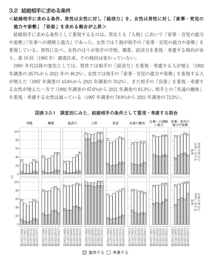 私の周りだけで巻き起こった異常気象かと思いきや、どうやら全国的に風向きが変わってきているらしい。2021年の国の調査(出生動向基本調査)によると、結婚相手に求める条件として相手の「容姿」を「重視する」もしくは「考慮する」と答えた女性は過去最高の81.3%を記録した。