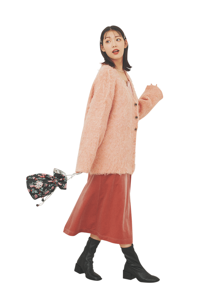 起毛カーディガン 6,490円/w closet(WEARS INC.) ベロアキャミワンピース 10,780円/ LILLIAN CARAT(リリアン カラット) ネックレス 2,090円/アネモネ(サンポークリエイト) 巾着バッグ 5,940円/キャセリーニ ショートブーツ 26,400円/エフ バイ ウェルフィット(ダイアナ 銀座本店) ヘアピン/ヘア&メイク私物