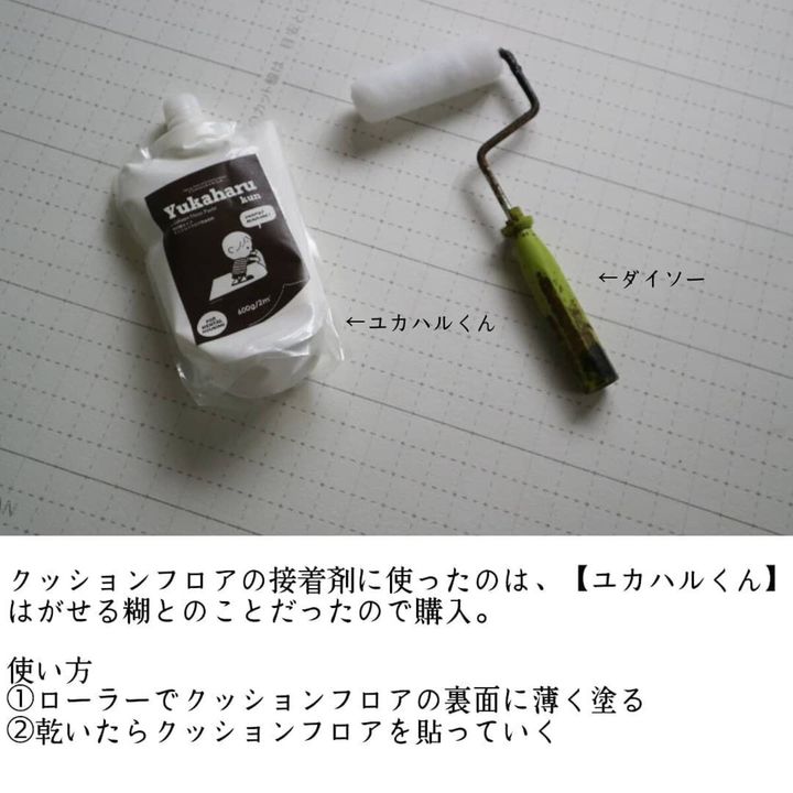 床にクッションフロアを貼る方法は、いくつかあります。両面テープを使う方法もありますが、今回は専用の接着剤を選びました。はがせる糊なので、なんと貼り直しができちゃうんです。初めてでも使いやすいですね。