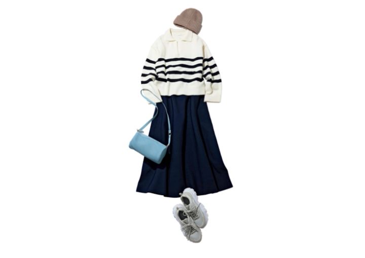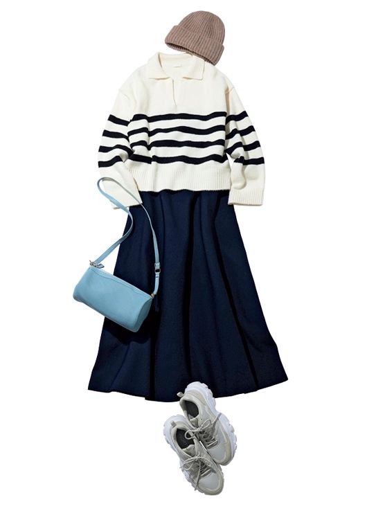 ニットセットアップ スカート¥11,000/PLST、ボーダースキッパーニット¥2,490、ニット帽¥990/ともにGU、ミニバッグ¥15,950/ペルケ(アンビリオン)、スニーカー¥8,800/ORTR( ダブルエー)