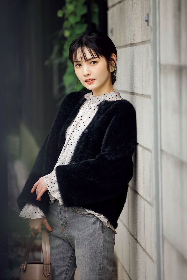 ノーブルな佇まいのドットブラウスでファージャケットに大人の気品を