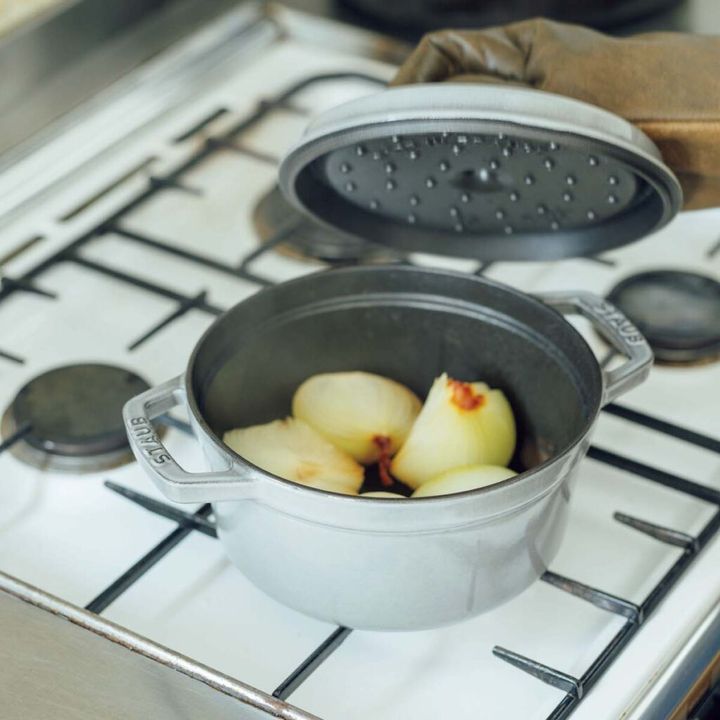「玉ねぎと少量の塩、水で蒸し焼きするだけで驚くほど旨味が出る、優秀な鋳物の鍋です」。豊富なサイズ展開のなかでも「ピコ・ココット ラウンド 20㎝」はメインディッシュから副菜作りまで幅広く使える万能サイズ。