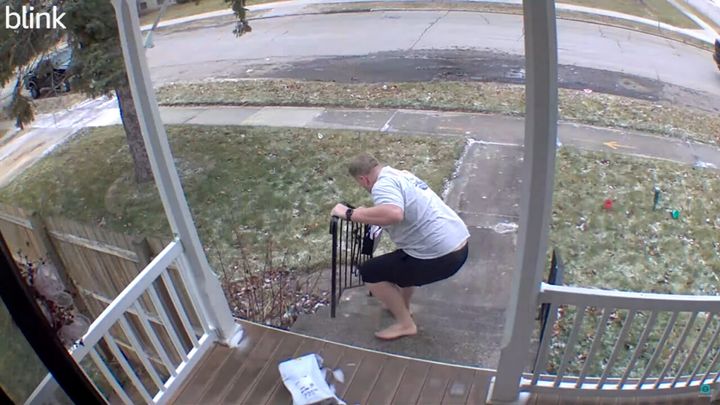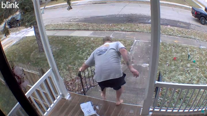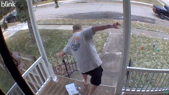ご紹介するのは、アメリカ・ウィスコンシン州のあるお宅に設置されたホームセキュリティカメラの映像です。 男性が届け物を回収するため、表に出てきた時の出来事です。