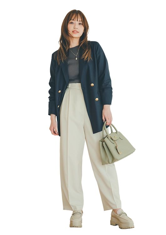 ジャケット¥22,000/マイストラーダ ニット¥7,480、パンツ¥10,450/ともにNATURAL BEAUTY BASIC ネックレス¥13,200/ステラハリウッド バッグ¥16,940/ペルケ(アンビリオン) ビジューつきローファー¥20,900/CELFORD ルミネ新宿1店