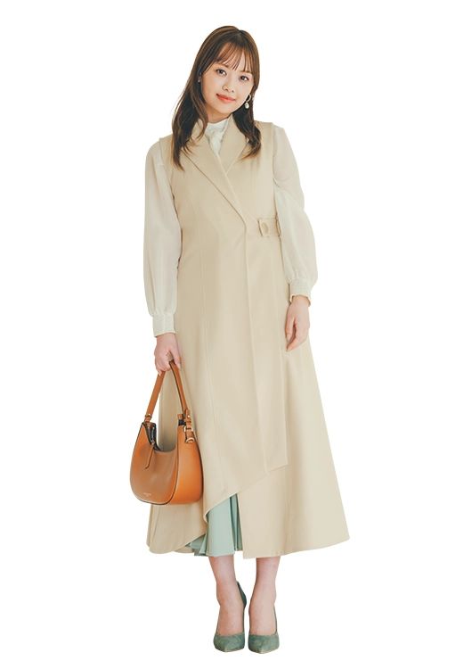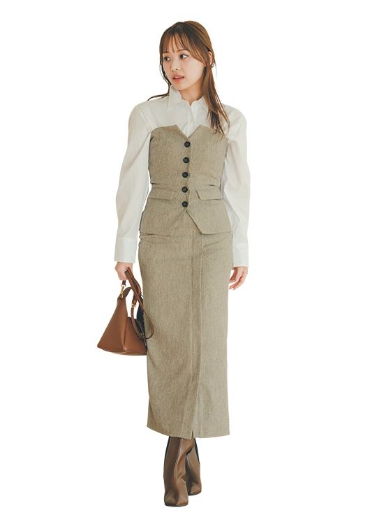 ノースリーブテーラードロングワンピース¥17,930/SNIDEL ルミネ新宿2店 ブラウス¥16,500/CELFORD ルミネ新宿1店 スカート¥14,960/ミラオーウェン ルミネ新宿2店 ピアス¥12,100/ステラハリウッド バッグ¥64,900/ジャンニ キアリーニ(ジャンニ キアリーニ銀座店) パンプス¥17,050/ダイアナ(ダイアナ銀座本店)