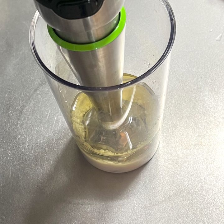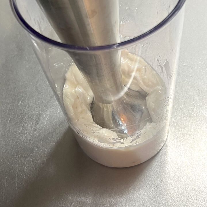 用意ができたらあとは混ぜるだけ。ミキサーだと1分かからずできるので時短になります。全体がもったりしてきたら、完成です。