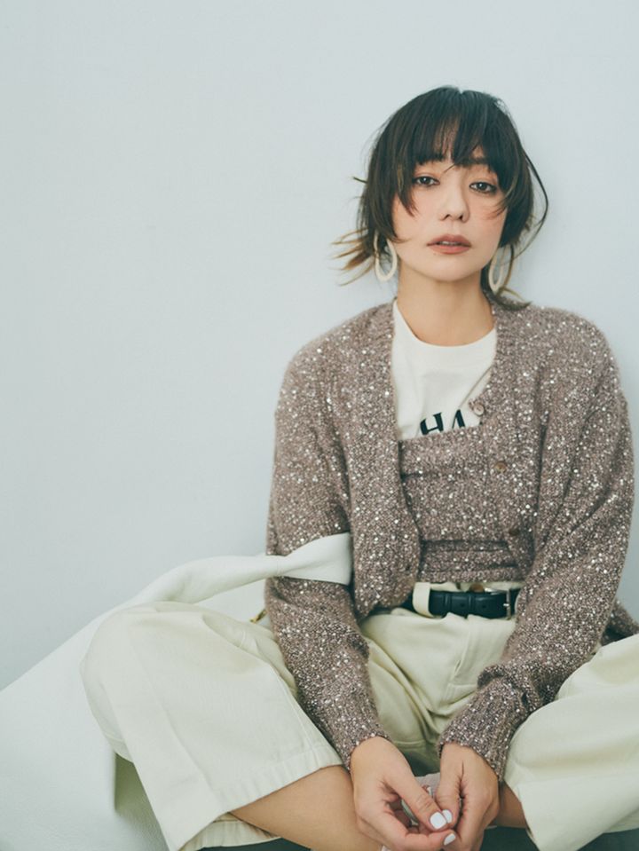 Tシャツにキラキラニットをレイヤード。40代に似合うちょい甘コーデテクを金子綾が伝授!