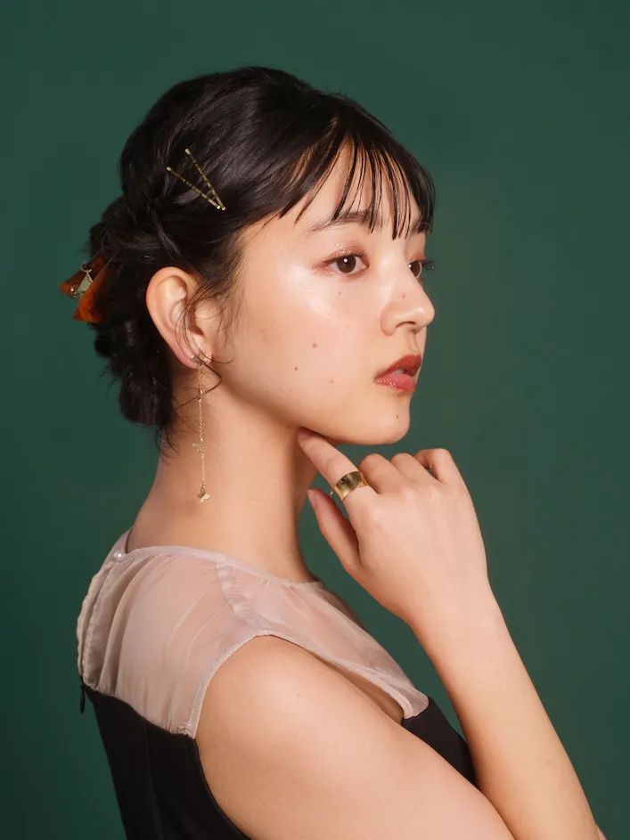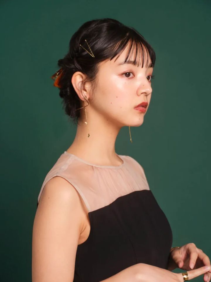 ゴールドピンとヘアクリップの飾りがさりげなく主張。洗練されたアップスタイルにほどよくカジュアルさを添えてくれます。襟足をタイトにまとめることで、首元がキレイに見えるのも嬉しいポイント。
