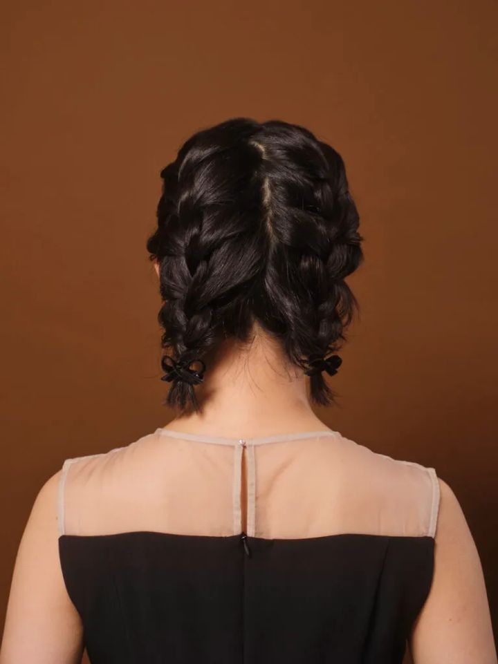 後ろからはこの雰囲気。編み込みの質感がしっかりあるので毛先に留める飾りはさりげなく、遊び心を感じるちびリボン型クリップを。黒を選んでワンピとバランスを取ります。