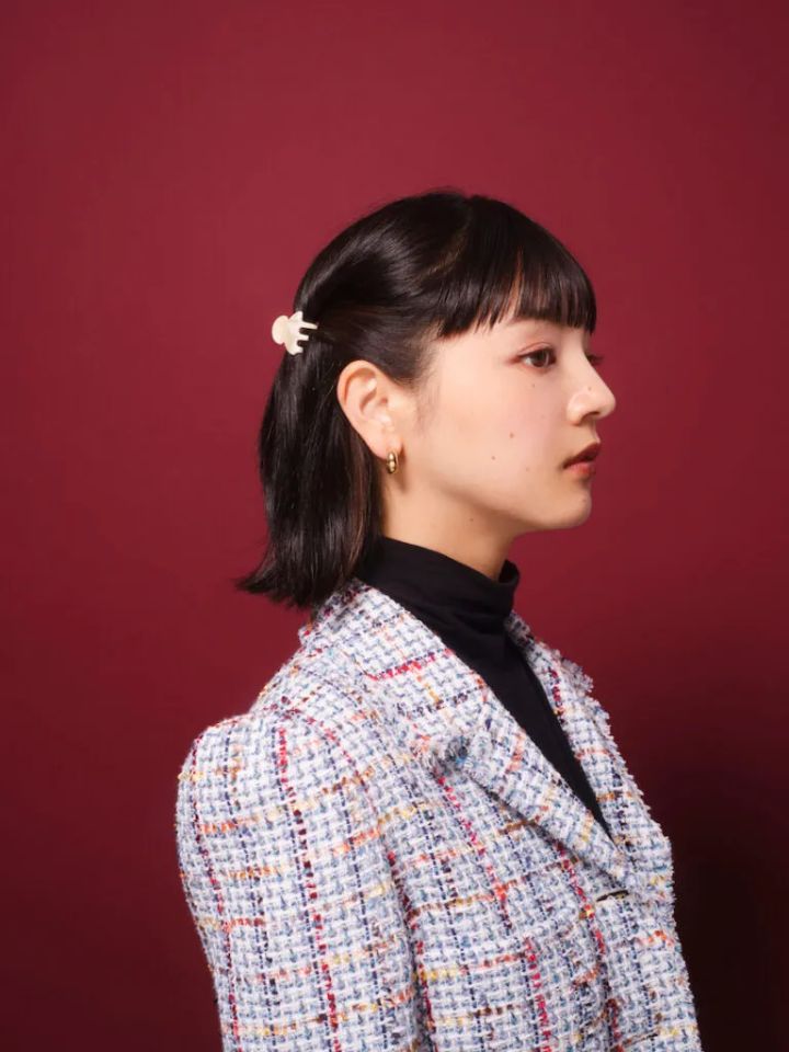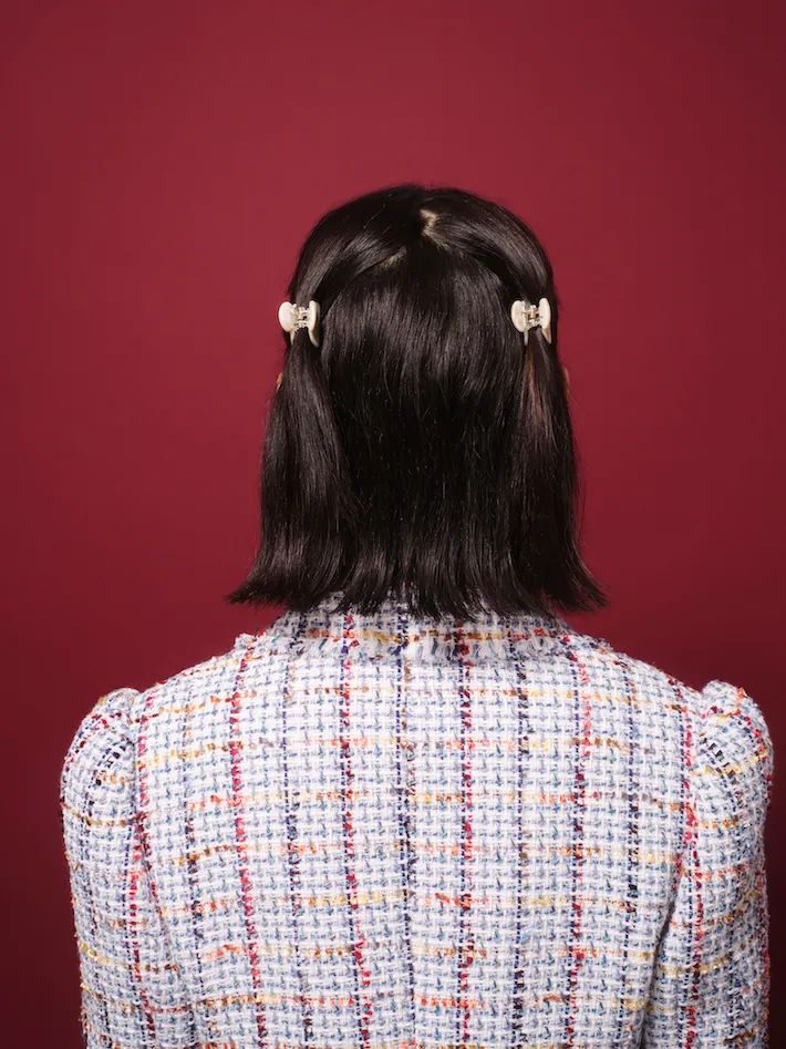 後ろから見るとこの感じ。ちょこんとシンメトリーに配置されたクリップの佇まいが可愛く、遊び心を感じます。ツイードジャケットの風合いもあって、どことなくレトロみが漂うのも◎。