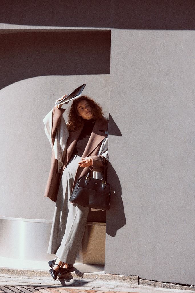 コートの上からさらにストールを足しても黒が軸ならスレンダーな見た目をキープ。揺れ感のある地厚なアイテムを重なるときは、クラシカルな黒レザーのシューズやバッグを合わせてスマートさを補強。