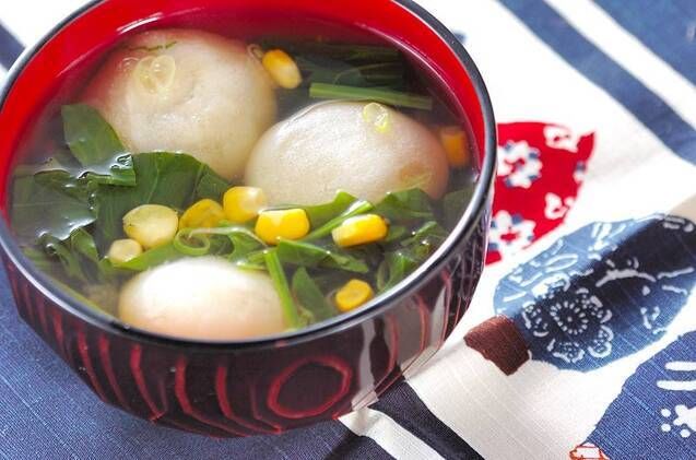 シンプルなだし汁で味わうホウレン草のお吸い物です。麩の水気をしっかり絞ると、お吸い物の美味しいだしがしみ込みます。水煮コーン入りなので、コショウをひと挽きすると、ピリッとアクセントの効いたお吸い物になります。