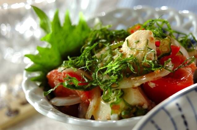 トマトやオクラ、玉ネギの他に豆腐も入れたさっぱり味のサラダです。ちらし寿司に肉の副菜を用意した時のお口直しにいかがでしょう。和えるだけで作れます。