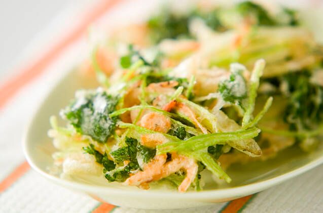 桜エビ、白ネギ、ミツバと、色もきれいな食材をさっくりとかき揚げに。簡単に作れてテーブルも華やく一品です。冷めても美味しいかき揚げは塩や天ぷらつゆで食べてください。