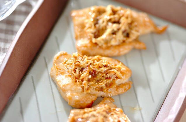 マヨネーズとおかかを乗せてささ身を焼いたシンプルですが味わい深い一品です。テーブルに出す際は、レタスやキャベツの千切りを下に敷いて乗せると華やかさがアップします。