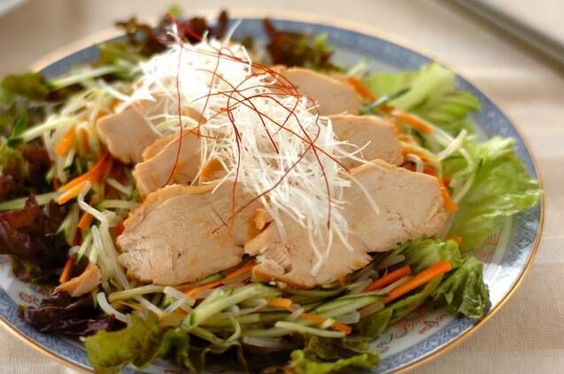 ヘルシーな鶏むね肉で作る自家製チャーシューはなんとレンジで簡単に作れるんですよ。甘辛味のチャーシューをたっぷりのサニーレタスに乗せたサラダは食べ応え満点です。自家製チャーシューは作り置きできるので、来客があるときはあらかじめ作っておくと便利です。