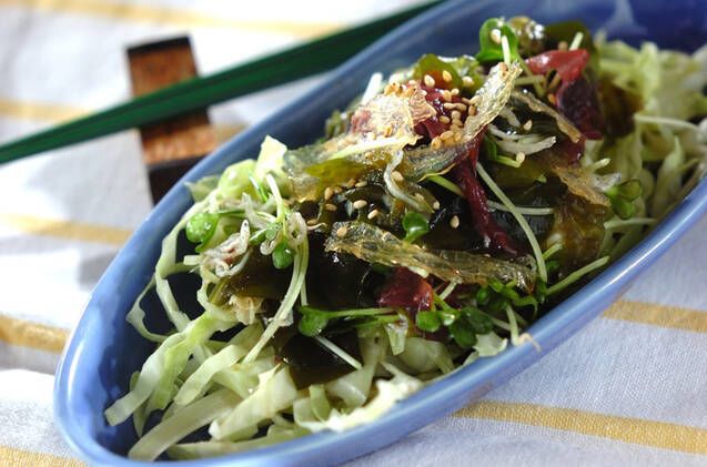 キャベツを入れてボリュームを出した海藻サラダ。しょうゆベースの自家製ドレッシングにはレモンを効かせてよりさっぱりテイストに仕上げます。箸休めに最適な一品です。