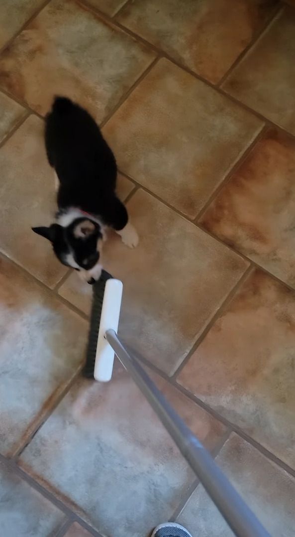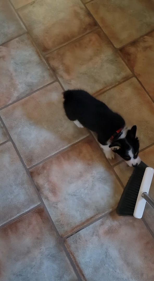 コーギーの子犬がお気に入りなオモチャというのは、掃除で使うホウキ。 飼い主さんは掃除をしているようですが、夢中で追いかけまわしたりパクっと噛みついたりして楽しく遊んでしまいます!