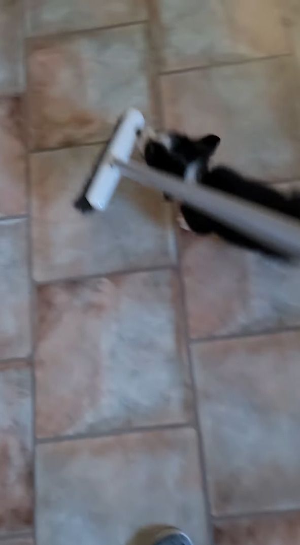 飼い主さんはお掃除中ですが、レックスには関係ありません。 動き回るホウキに、レックスはパクっと噛みつこうとしています。