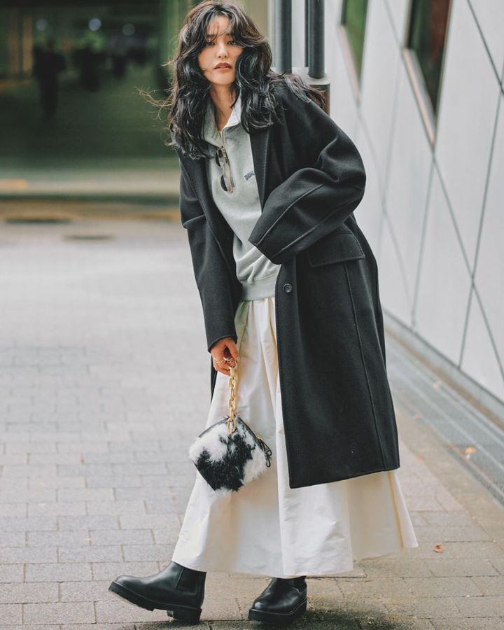 フェミニンアイテムの王道「白スカート」は、着こなし次第で大人カッコいい装いに味変できる万能アイテム。いつもの「黒コート×ブーツ」と合わせれば、冬の重い印象に抜け感が加わります。さらにグレーのスウェットでラフさをプラスすれば、かしこまったモノトーンコーデがマイルドに。