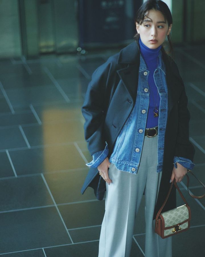 「デニムジャケット」を真冬に取り入れるならレイヤードアイテムとして使うのが正解。かっちりまとまったオフィスコーデの調整役としてほどよく着崩してくれるので、一気に上級者見えが叶います。インナーにブルーのタートルニットを仕込めば、濃淡の効いたグラデーションで奥行きが生まれ、好バランスに。