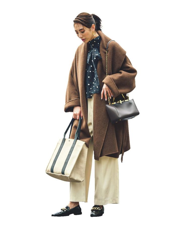 コート¥102,300(スタニングルアー/スタニングルアー 新宿店)ブラウス¥25,300(エーケーワン/デミルクス ビームス 新宿)パンツ¥29,700(マルティニーク/マルティニーク ルミネ横浜)ショルダーバッグ¥184,800(ザンケッティ/アルアバイル)トートバッグ¥36,300(フランソワ レニエ/ヤマニ)ローファー¥12,650(ル タロン/ル タロン 有楽町マルイ店)ピアス¥4,400(アビステ)