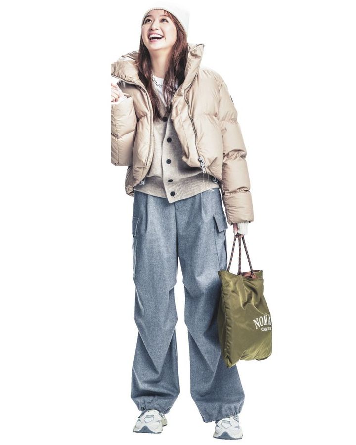 ダウンジャケット¥248,600(カナダグース)スウェット¥8,250(チャンピオン/チャンピオン ブランドハウス シブヤ トウキョウ)カーディガン¥42,900(エイトン/エイトン青山)パンツ¥42,900(サクラ/インターリブ)バッグ¥14,300(ノマディス× デミルクスビームス/デミルクス ビームス 新宿)スニーカー¥22,000(ニューバランス/ニューバランスジャパンお客様相談室)ニット帽¥18,700アームウォーマー¥14,300(ともにジョシュアエリス/グリニッジ ショールーム)ピアス¥11,000ネックレス¥18,700(ともにワンエーアールバイウノアエレ/ウノアエレ ジャパン)