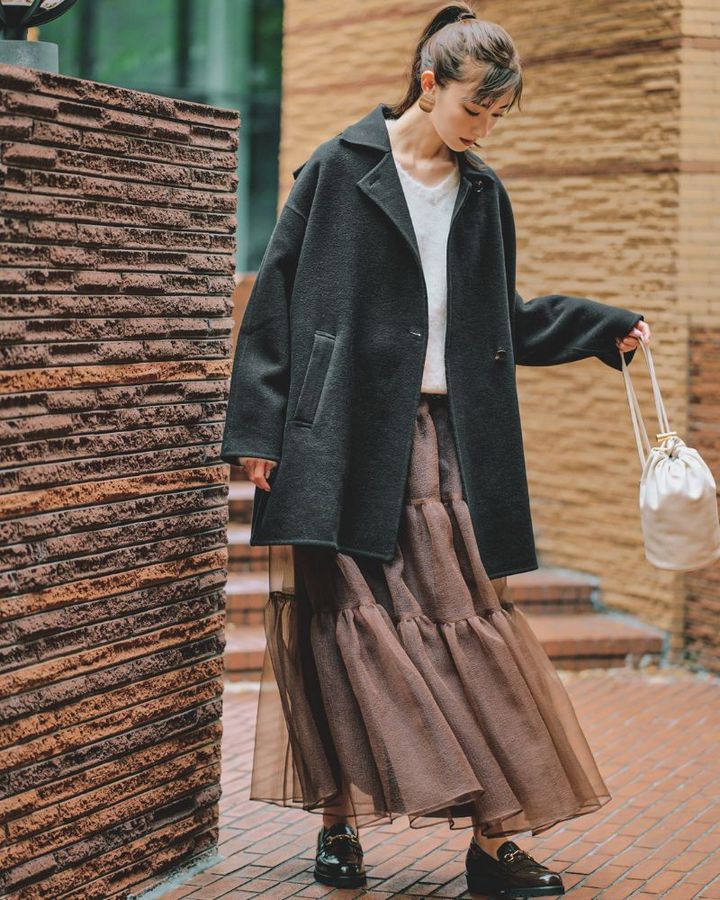旬の「チュールスカート」は華やかなディテールだからこそ、シルエットが活かせるような組み合わせを意識。ロングコートではなく流行りのミディアム丈で動きをつければ、スカートの存在感をたっぷり残した着こなしが叶います。ほかのアイテムはモノトーンでシックにまとめて、悪目立ちを防ぐのがポイントです。