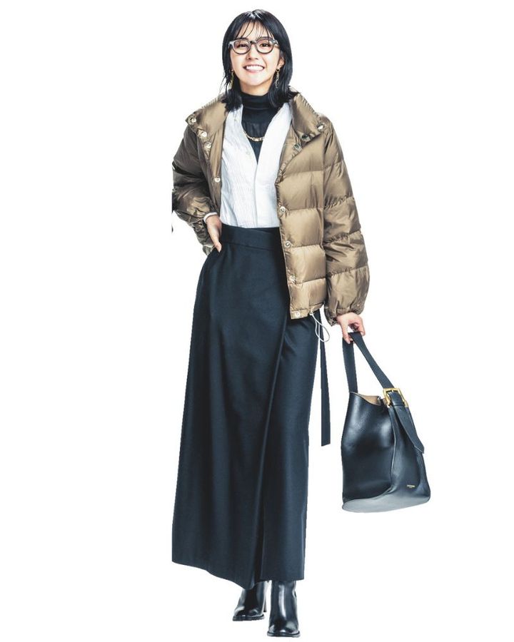 ダウンジャケット¥79,200(マッキントッシュ/マッキントッシュ ギンザシックス店)シャツ¥28,600(トラディショナル ウェザーウェア/トラディショナル ウェザーウェア ルミネ有楽町店)ニット¥31,900(スローン × デミルクス ビームス/デミルクス ビームス 新宿)スカート¥57,200(エイトン/エイトン青山)バッグ¥169,400(J&M デヴィッドソン/J&M デヴィッドソン カスタマーセンター)ブーツ¥141,900(ジェイエムウエストン/ジェイエムウエストン 青山店)メガネ[セットレンズ込み]¥11,100(ゾフ/ゾフ カスタマーサポート)ピアス¥8,800ネックレス¥35,200(ともにワンエーアールバイウノアエレ/ウノアエレ ジャパン)