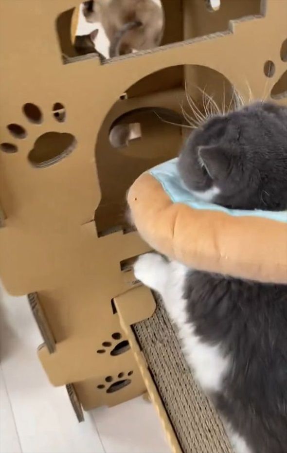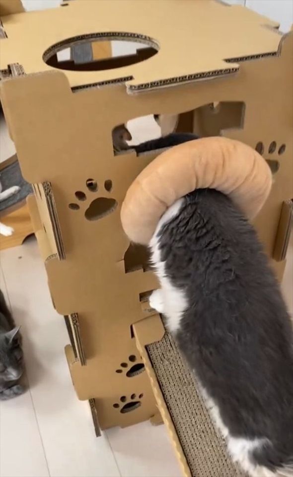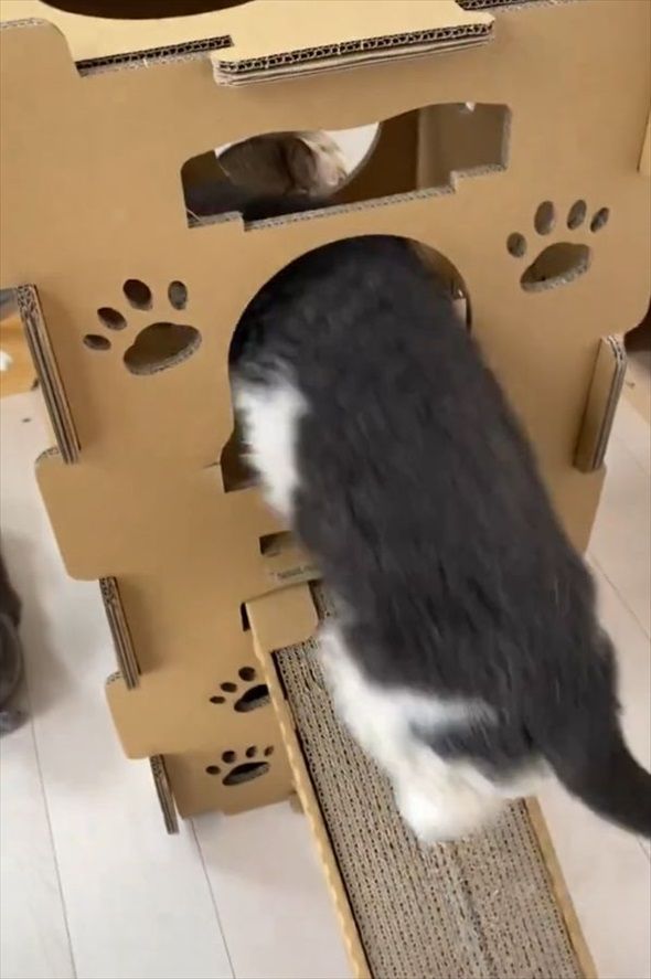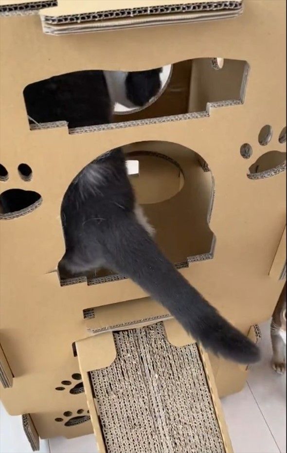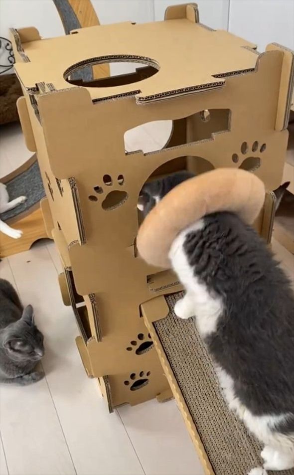 エリザベスカラーを装着した猫がダンボールハウスの中に入ろうとしていましたが・・・